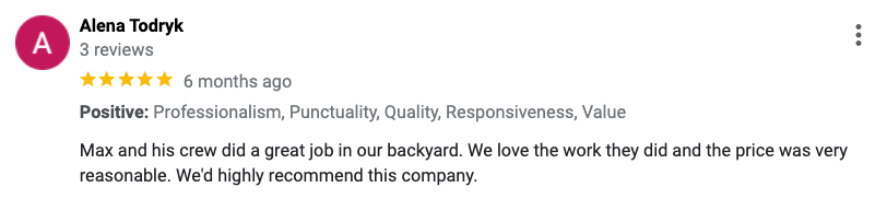 Shelby Holsapple"My yard looks amazing and I'm really happy with how the landscaping turned out. My compliments on your professionalism and speed of the job. Thank you to you, Max, and your crew for all the hard work in landscaping my yard"