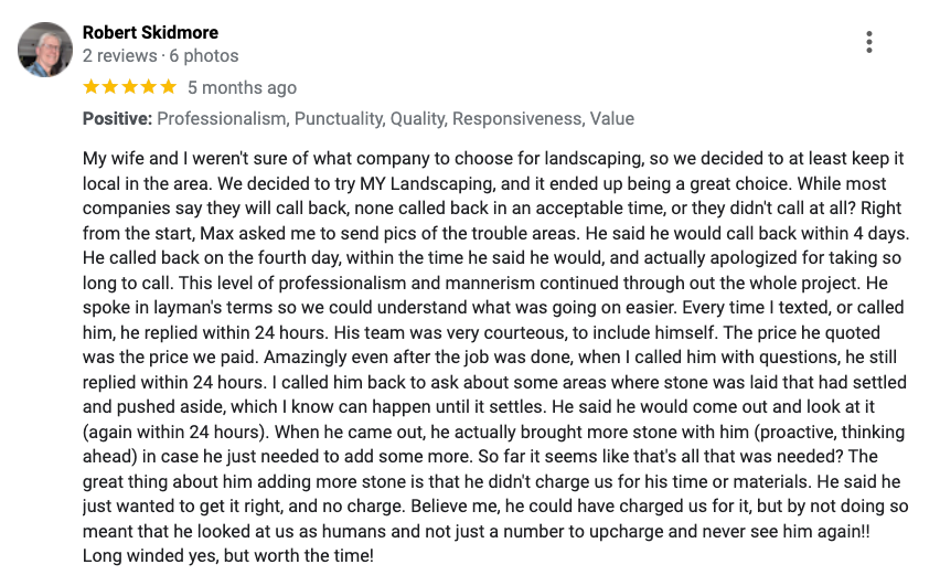 Lady di"Max came to our home to regrade our lawn. His team was fast, efficient, and very kind! We have a lot of kids and they were very nice to them. He was also very good at explaining upkeep and gave us some good tips for managing the new lawn with all of the kids around. Pricing was very reasonable. We will definitely be having him back for future landscaping projects and would recommend this company 100%."