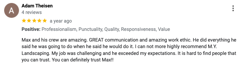 Ney Hargan"We had a great experience working with Max and M.Y. Landscaping. Max was professional, easy to communicate with, and worked closely with us to bring our ideas to life. He was also very fair with pricing and delivered everything on time—no delays or surprises."